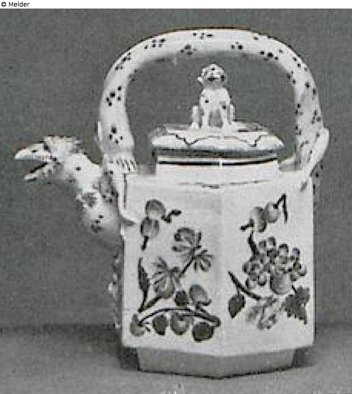 Refers to Eastasian examples. Six-sided. The spout in shape of a dragons head, the handle in shape of a ...-alike fabulous creature. Underneath the spout a relief-mouldes mask of a faun. At caover a Fo-dog as knob. The relief-moulded parts painted in purple and light green. The sides of the pot painted with enamel colours with blossoms and fruits. Golden rim. Without mark. Vienna, by Du Paquier (1718–1744). Literature: Auktionskatalog Hans W. Lange, Wertvolles Kunstgewerbe, Berlin, 19.-21. Mai 1941, S. 125-126. Nr. 620, Taf. 75 (DOI: external link)