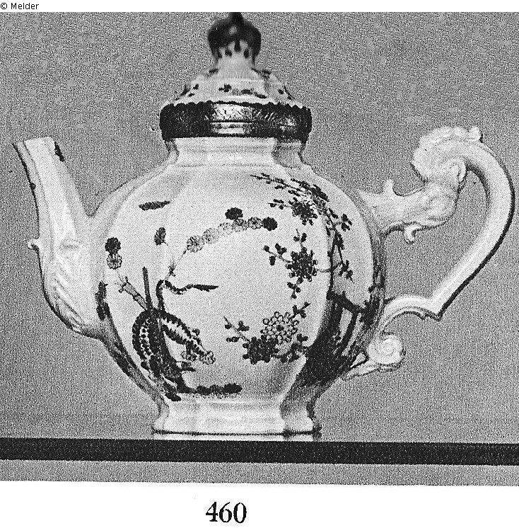 aus einem kurfürstlich sächsischen Service. Kugelförmiger Körper, durch acht senkrechte Rippen in vier größere, gebauchte und vier kleinere, konkave Felder geteilt. Barocker Volutenhenkel, steiles Ausgußrohr mit Blattansatz. Bemalung: "Gelber Löwe" (Tiger) hinter Bambus und blühende Kirschbaumsproß an knorrigem Baumstumpf. Am Deckel kleine indianische Streublumen. AIs Knauf rot und schwarz staffierter Kurhut. Scharnierfassung aus graviertem und vergoldetem Kupfer. - Fuß bestoßen, Ausgußrohr am Ende abgeschliffen. Marke: Schwerter mit Punkt; Quelle: Julius Böhler: Versteigerung von Kunstwerken aus dem Besitz der Staatlichen Museen Berlin, Auktion vom 1.-2.06.1937, München 1937. Katalognummer 460