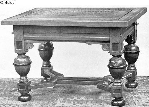 Tisch mit Intarsien auf kegelförmigen Beinen mit kreuzförmigen Verbindungen