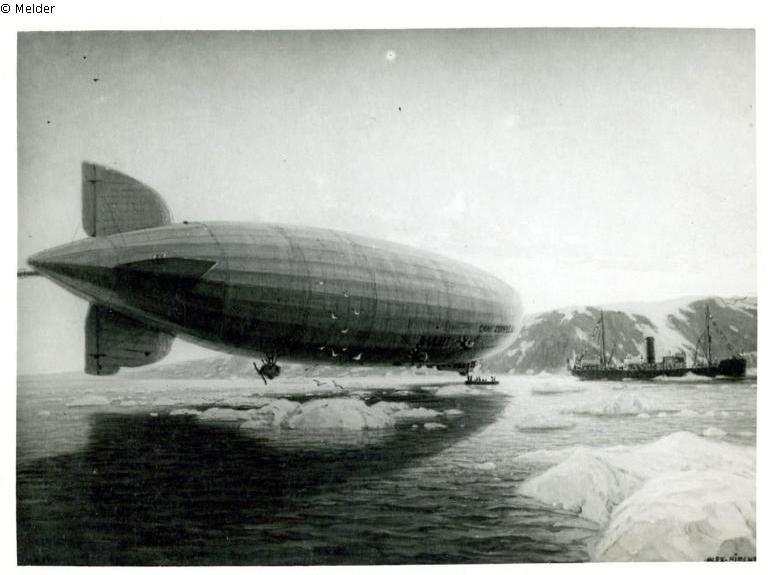 Das Bild zeigt eine Szene auf der Arktisfahrt des Luftschiffes LZ 127 "Graf Zeppelin" am 24.7.1931. Das Luftschiff steht dicht über Eisschollen, ein Ruderboot daneben, in der Bildmitte liegt rechts ein wuchtiges Dampfschiff; im Hintergrund sieht man felsigen, vereisten Küstensaum. Gezeigt wird die Landung des Zeppelins in der Bockerbucht während seiner Nordarktisfahrt und die dortige Begegnung mit dem sowjetischen Eisbrecher "Malygin". Dort tauschten beide Post miteinander aus.