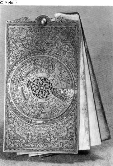 Two oblong silver tablets, each with a curved short side; the curved sides each with three drilled holes; the outsides of the tablets decorated with leaf- and strapwork: curved acanthus tendrils, twining around sticks towards the short sides; on the edges of the short sides, a shell is used as the main decorative motif; in the middle of each tablet, a "calendarium perpetuum" is fastened, taking the shape of rotating discs with the names, days and symbols of the months, the courses of the sun, moon and stars etc.; on one tablet, there are two discs on top of each other; the other one has the goldsmith's signature "Ioh : Mettel . fecit et sculps : A. Gotha : 1732" on its back; on top of this signature, "F.VERMEULEN" was later added in irregular letters (probably the owner's name).