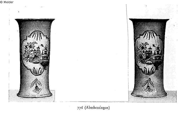 Two flute vases. Blue framed reserves on a yellow ground enlivened by some scattered flowers, all containing the same motif, a seated Chinese man in a landscape. One flute vase heavily puttied. Abtsbessingen (mark: K); Hö