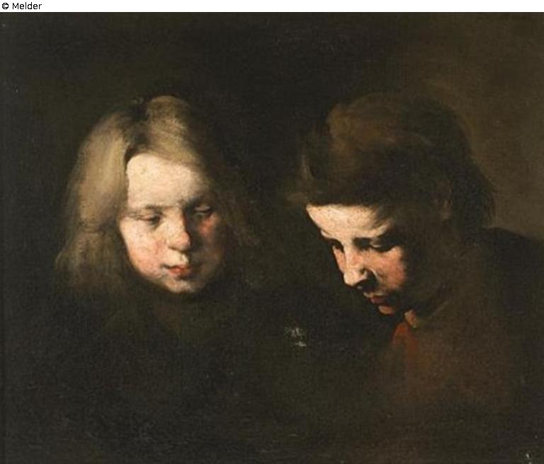 Parke-Bernet: Two childen seen at bust length, one with brown hair looking downwards, wearing a red sweater, the other fair-haired, their features strongly lighted from the left. Signed at upper right T. RIBOT. (Hanak) [Marginal:] 170