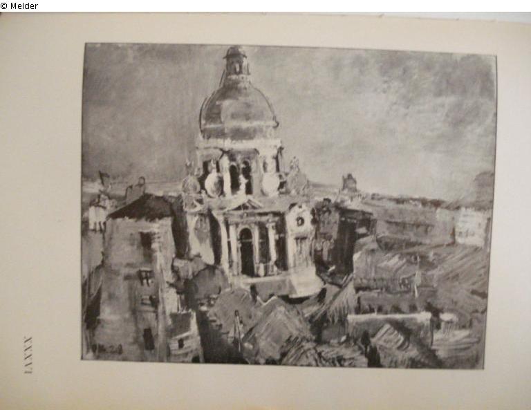 Overlooking on the roofs ant the church Santa Maria della Salute in Venice. On the back a enclosed slip of the 18th Biennale in Venice 1932, number 256, signed bottom left: O K 28