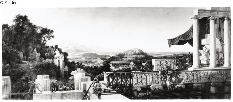 Panel painting: depiction: aboveground components (construction activities) & column, pillar (architecture) & sculpture, reproduction of a sculpture & mountains, mountains & prospectus of a city, panorama of the city, silhouette of a city & river; width approximate value (approx.)