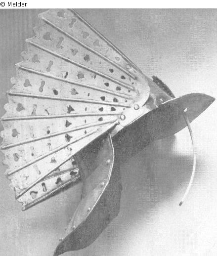 Die kammlose Glocke wird durch einen angenieteten, spitzen Augenschirm, ein verstellbares, durchbrochenes Naseneisen und einen Nackenschirm komplettiert. An den Seiten der Helmglocke wurde je ein großer gerippter, in Loch- und Herzform durchbrochener Flügel angenietet. Die Wangenklappen fehlen.