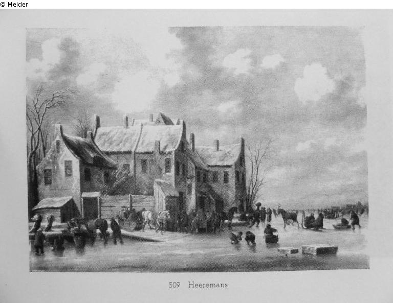 Schlossähnliches Gehöft an einem zugefrorenen Fluss, auf welchem viele Schlitten und Schlittschuhläufer zu sehen sind. Bez.r.u.: Th. Mans, dat 1668. Goldrahmen.