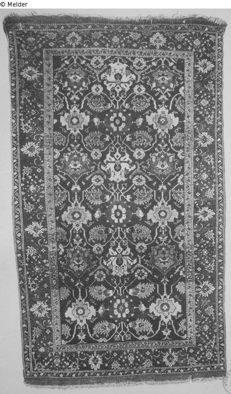 Roter Grund mit bunten vegetabilen Motiven in der Art der persischen Vasen- und Isfahanmuster: Rosettblüten, Palmettblumen, Zackenblätter usw. in symmetrischer Anordnung, durch ein feines, gelbes Rankengitter verbunden. Blaue Borte mit Palmettblüten zwischen Blumenzweigen in bunter Skala, vorwiegend rot, weiss und gelb, in der Art der Uschakteppiche des 17. Jahrhunderts. Begleitrand innen hellblau, aussen rot, mit Blattwelle. Gehört vermutlich zur Gruppe der sogen. Melas-Teppiche. (Weinmüller: 17. Jahrhundert)