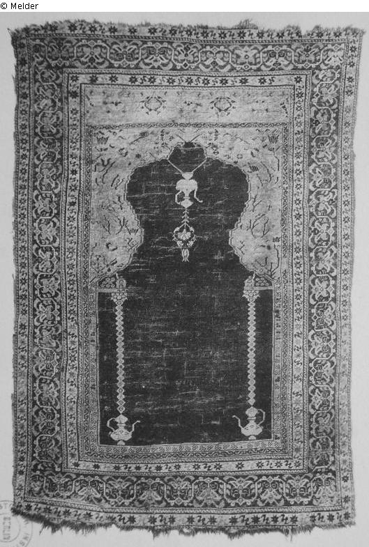 Gebetsteppich mit ziegelrotem Nischenfeld; seitlich je eine Kanne mit stilisierter Säule darüber und eine dritte Kanne von der Mitte herunterhängend, statt einer Ampel. Die Wölbungszwickel ockergelb mit dünnem, vorwiegend schwarzem Rankenwerk; im Friesstreifen darüber Palmettmotive. Blaue Borte mit stilisierter Blütenwelle. Die Begleitränder weiss mit Streumuster, beide mit rahmenden Säumen. Sogen. Györdes-Teppich. (Weinmüller: 17. Jahrhundert)