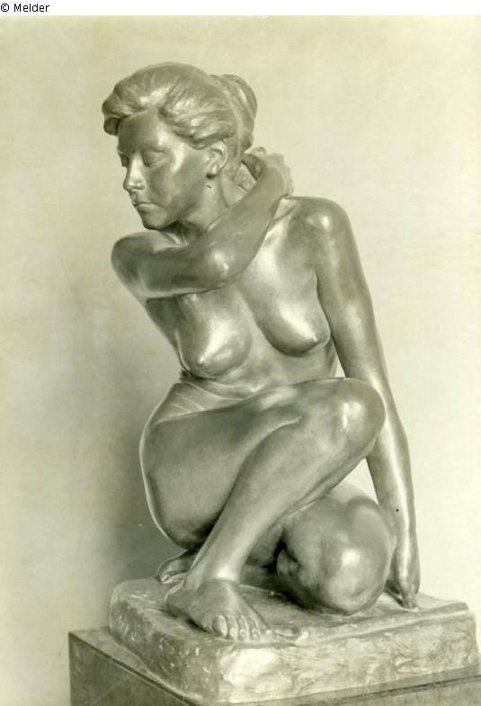 The youthful woman squatting on the ground, l. hand holds the sponge and bring sit to the left shoulder. The body is shown an a small space, so ist bent in an interessting kind.