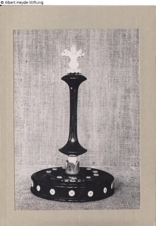 Turned spool for textile handicrafts, made of black polished wood. Mounted on a round base decorated with bone rosettes so that it can rotate. Crowned with a double-headed bone figure.