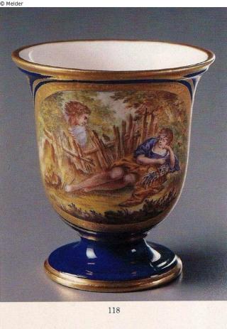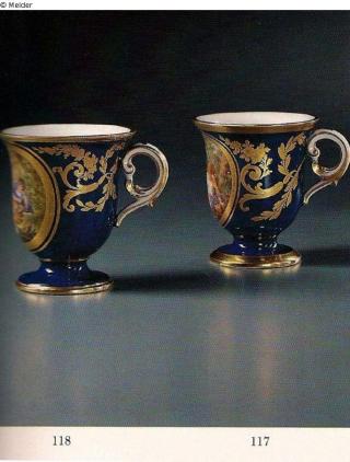117: U-förmig auf runden Fuß mit auslaufendem Rand, appliziert mit einem teilvergoldeten ohrenförmigen Henkel, bemalt von Philippine l'ainé mit Narcisse métamorphosé en fontaine in einem ovalen Landschaftsmedaillon, reserviert auf dem dunkelblauen Fond und flankiert von goldenen Blumen und Blätterranken, Goldränder.
