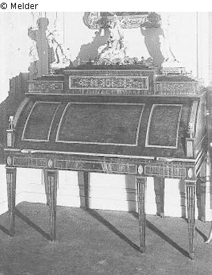 mit Bronzebeschlägen. Beschreibung Lange: Helles Mahagoniholz. Auf acht kannelierten spitzen Beinen. Die gewölbte Fläche ist durch Leisten und vergoldete ziselierte Bronzebeschläge in drei Felder geteilt, an jeder Seite ein Kerzenhalter aus Bronze. Der abgetreppte Aufsatz mit Bronzegalerie hat drei Schubladen, die mit fein ziselierten Bronzerankenornamenten belegt sind. In der Zarge drei Schubladen. — Im Innern Treppenarchitektur als Geheimfächer. Grüne Lederplatte mit Goldpressung. Hauptwerk aus der Zeit um 1780; Quelle: Rudolf Simonis: Inventory of the Art Collection of Hermine Feist-Wollheim, undated. In: Leo Baeck Institute, New York. AR 7019 / MF 551. Series XIV: Varia, undated, 1700s-1922. Box 9 Folder 10. Möbel; Hans W. Lange: Gemälde und Kunstgewerbe aus einer bekannten Privatsammlung - Verschiedener Kunstbesitz. Berlin. Versteigerung am 22. und 23. Juni 1939. Katalognummer 168, dort unter der Abkürzung K.S., Berlin; vgl. Fotografien von Martha Huth, in: LAB, F Rep. 290-05-01 Nr. 35ff. und Anmerkung 113 von Sebastian Kuhn: Collecting Culture. In: Maureen Cassidy-Geiger: The Arnhold Collection of Meissen Porcelain, 1710-50. London 2008, S.116; Hermann Schmitz: Deutsche Möbel des Klassizismus. Stuttgart 1923. S. XXIV, Tafel 21. — Hans Huth: Abraham und David Roentgen. Berlin 1928. S. 64. Tafel 37; Krutisch, Petra: Schreibmöbel der Neuwieder Roentgen-Manufaktur in der Sammlung des Germanischen Nationalmuseums. In: Anzeiger des Germanischen Nationalmuseums. (2005), S.151-172, insbesondere S.163ff und 171 (Fußnote 82).