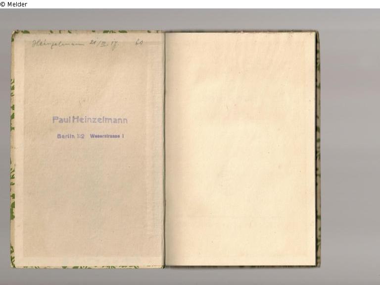 Search Request | Person Heinzelmann, Paul Contact Please contact the German Lost Art Foundation. Departments Provenance marks 1 Book signature 2 Ex libris Paul Heinzelmann 3 handwritten signature 4 Stamp 5 Stamp 6 Stamp 7 Stamp and handwritten signature: Heinz Elm (pseudonym) Storage sites Groups of reported objects 1 Book 2 Periodical Collections Holdings