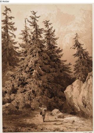 Found-Object Report Hikers by a stream with fir trees and rocks Artist / Creator Calame, Alexandre Object type Drawing Material / TechniquePaper ; Ink brown ; Pencil / drawn ; washedLost Art-ID596304