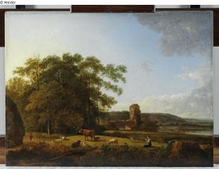 Search Request Italian landscape with the herdsmen who follow bovine animals, goats and sheep, in the far a castellet Artist / Creator Klengel, Johann Christian Object type Drawing Material / TechniqueInk ; Paper blue / drawn (pen-and-ink drawing)Lost Art-ID143939