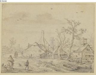 Found-Object Report Dutch village with farmhouses, dovecote and rider Artist / Creator Molijn, Pieter de Object type Drawing Material / TechniqueChalk ; Ink ; Paper / drawn ; drawn (brush)Lost Art-ID584840