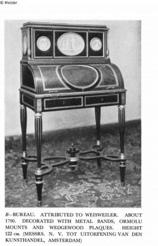 Search Request Bureau (ladies' writing desk) | Cylinder bureautje Artist / Creator Weisweiler, Adam (attributed to) Object type Furniture Material / TechniqueInlay (Rosewood) ; Metal (Bronze) / gildedLost Art-ID601230